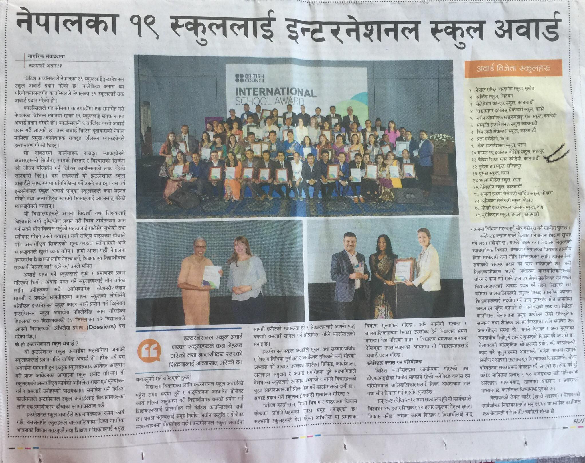 ब्रिटिश काउन्सिलले नेपालका १९ स्कुललाई इन्टरनेशनल स्कुल अवार्ड प्रदान गरेको छ । कनेक्टिंग क्लास रुम परियोजना अन्तर्गत काउन्सिलले नेपालका १९ स्कुललाई उक्त अवार्ड प्रदान गरेको हो ।
